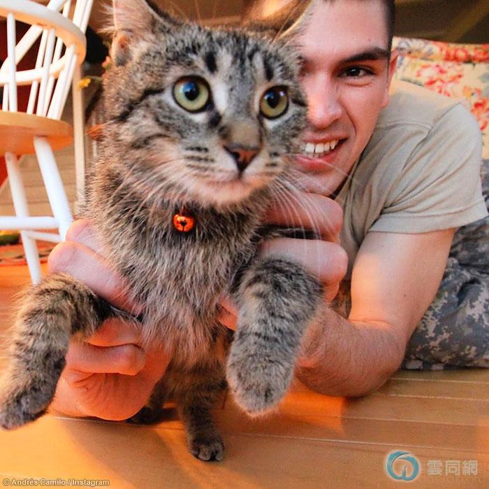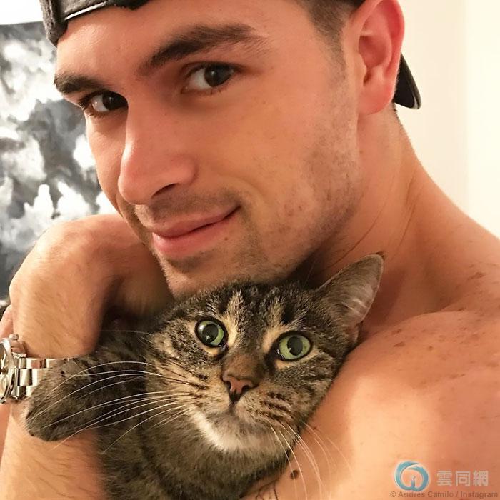 他长相稍显呆萌,有着一颗极度爱喵的“铲屎官之心”