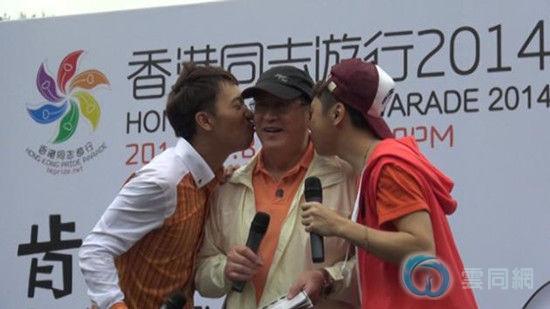 香港平等机会委员会主席周一岳(中)出席活动,获主持人献吻。