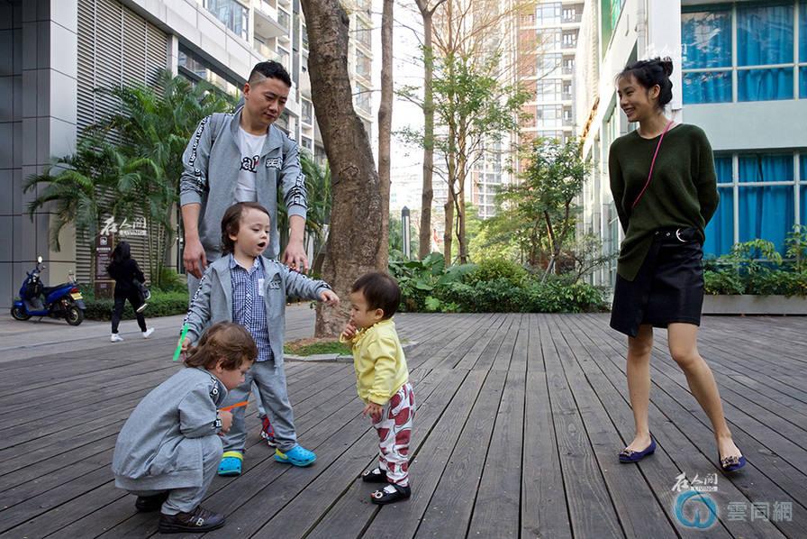 “从农村到城市十年奋斗,自己先天条件不足,外貌身高不出众,遭遇不少歧视。相信像我这样遭遇的人不少,只是我比较幸运遇上改变命运的机会,用科技改变下一代基因,有了混血宝宝,让孩子不再走我的艰辛之路。”安徽称。图为安徽带着孩子在小区里玩耍。