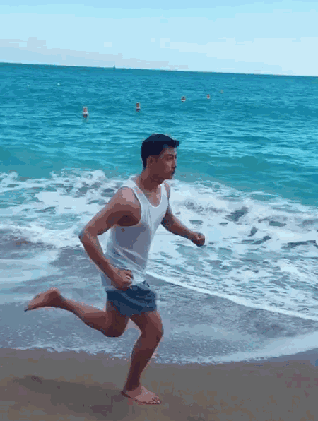 穿着短裤海边跑步,粗壮的手臂非常明显。