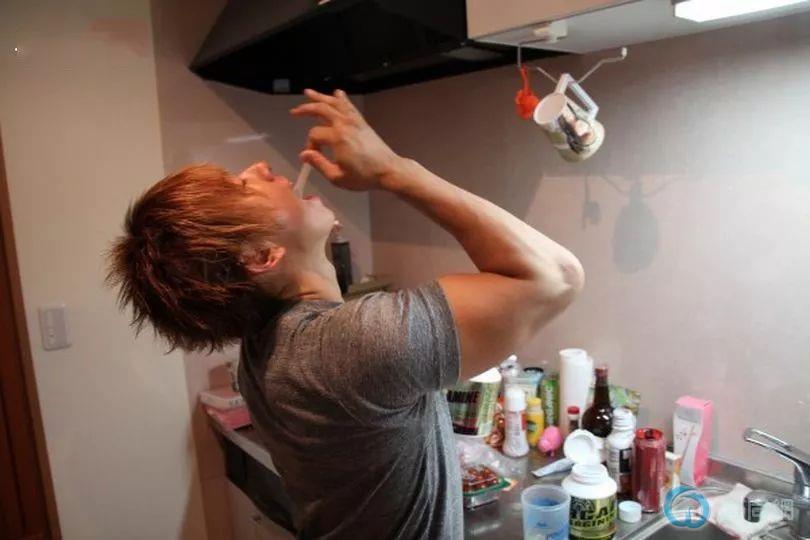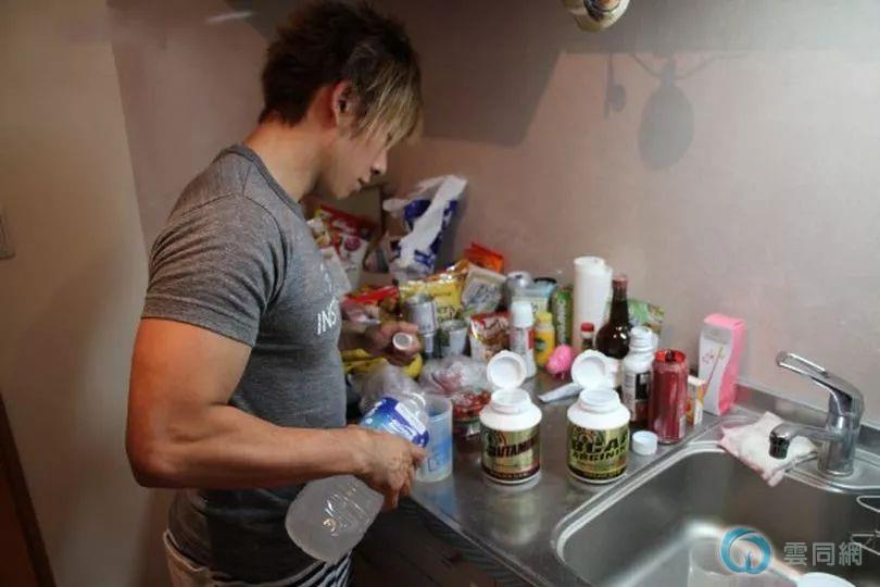 早上8点是早餐时间。因为体质的缘故,清水健用热水兑运动饮料,并且吃谷氨酸和支链氨基酸组成的粉末。