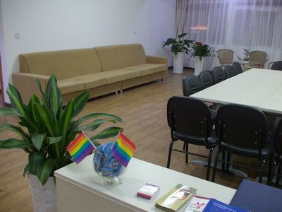 书架摆放在靠里的那面墙的两个墙角。书籍渐渐多起来,成为来这里的朋友的精神食粮。北京纪安德健康教育研究所主办、北京(99575)同志健康热线承办的《分享与交流》特刊,台湾同志咨询热线协会编写的《同志咨询热线》,成都同志关爱小组主办的《同心HOMOHEART》,青岛大学医学员附属医院性健康中心主办《朋友》……除相关同志资料外,还有防艾以及社会类书籍。七点钟,很多人准时来到社区,拿本书静静坐在座位上翻阅着,或者几个朋友坐在书架前交流谈心。