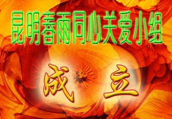 2005年3月5日在昆明市健康教育所的组织下,在春雨茶室建立了一支专门为同志提供互助的关爱小组“昆明春雨同心关爱小组”。小组成员有15人其中同志人群12人(女同2人),非同志人群3人(专业技术人员)。小组以志愿者为主开展同志健康教育工作,专业技术人员提供技术资源指导。同时大家确立了小组的名称为“昆明春雨同心关爱小组”,