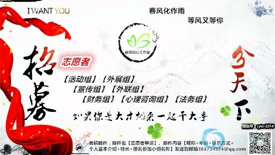 春雨同心工作室成立于2005年7月,是由昆明同志社区人群发起,在昆明市健康教育所及国际基金的支持下,成立的同志社会公益组织。十二年来,我工作室始终以团结同志社区人群、建设同志文化、公共卫生,社群心理健康及相关法律事务等方面为核心工作内容,致力于消除社会主流对同志人群的刻板印象,提升同志身份的社会认同和自我认同,并提倡同志婚姻合法化。多年来,在社区人群的大力支持下,如今我工作室共有昆明市区及呈贡区两个办公地点,5位全职工作人员,并成功申请到国家级、省级、区级项目经费支持。现因发展需要,渴望人才,特向昆明市及云南省范围内招募社区志愿者,愿有志之士、热诚之士踊跃参加。