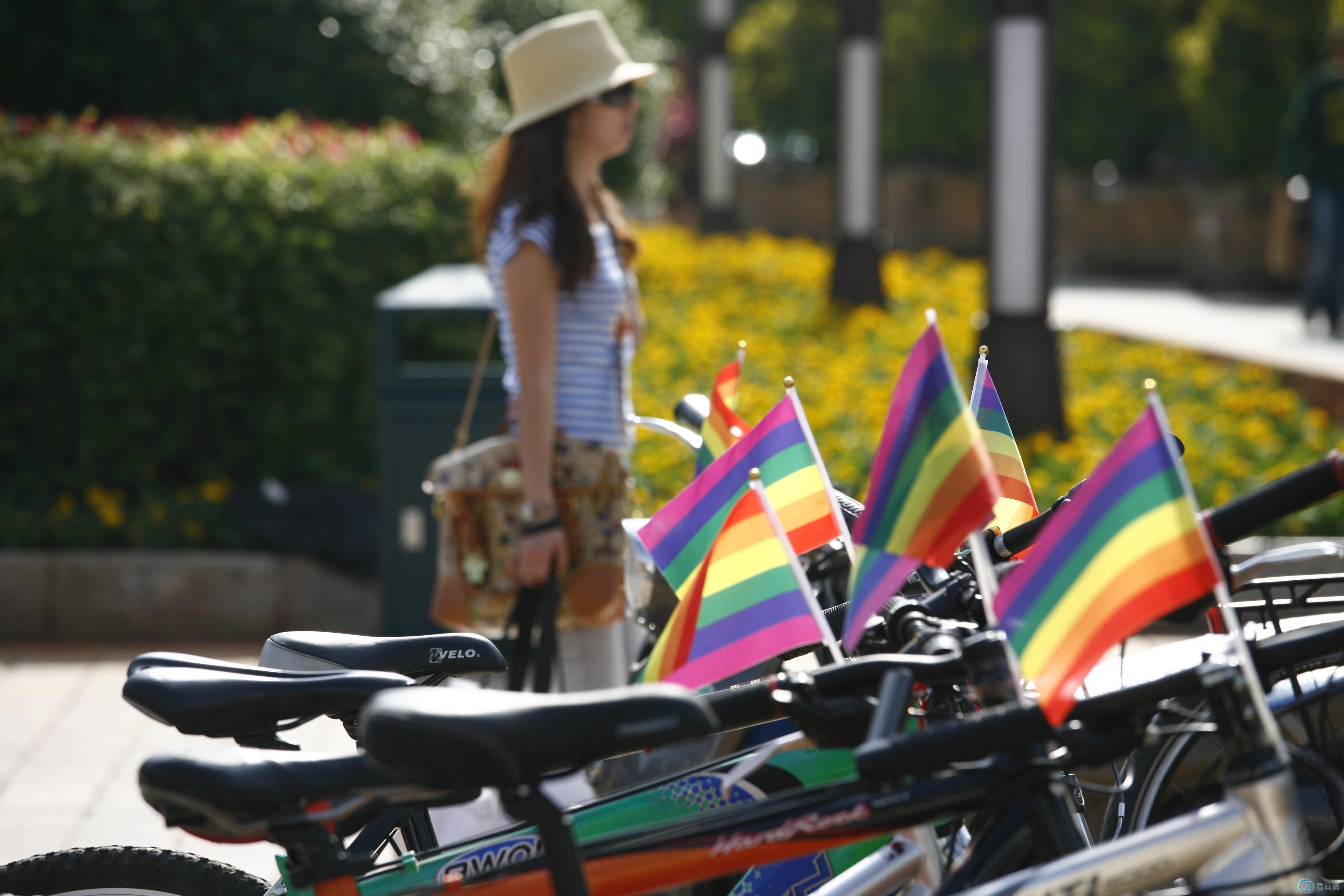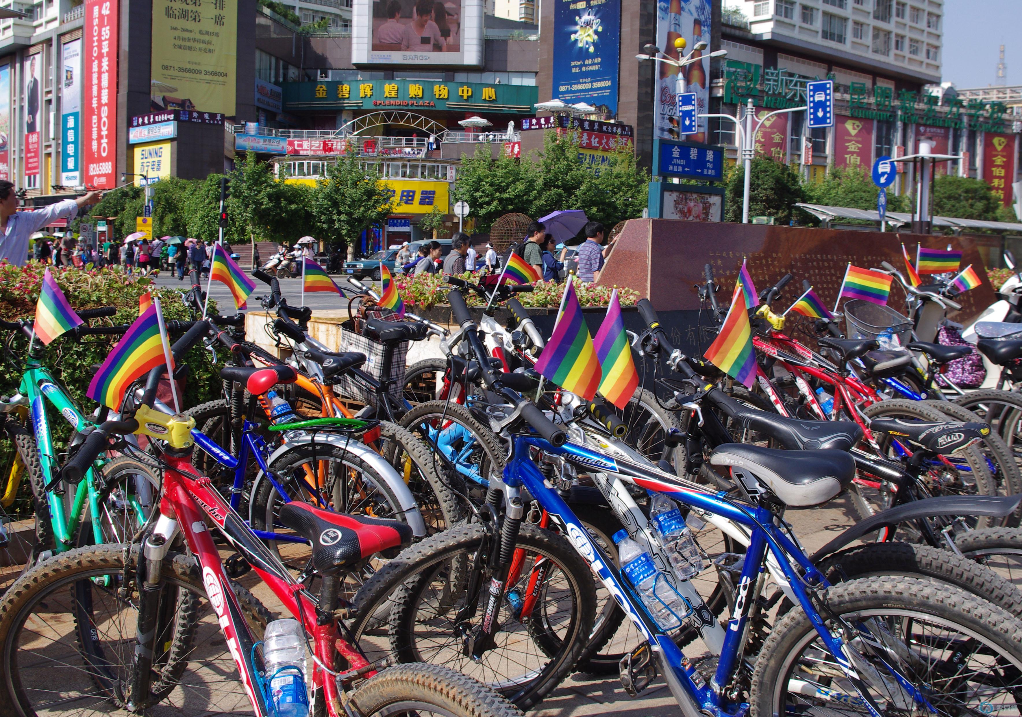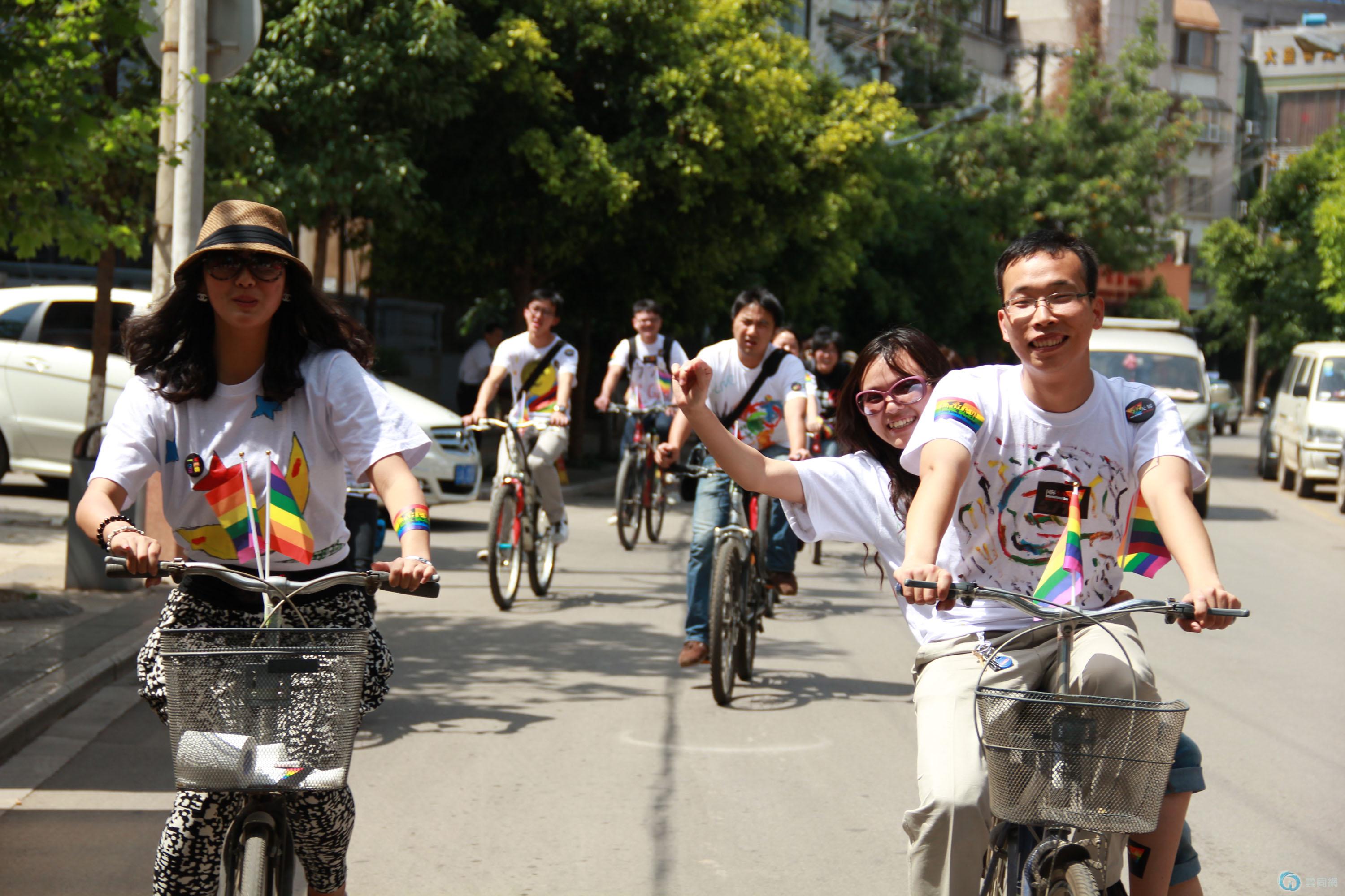 向路人介绍本次活动,进行交流。两位情侣坦诚自己20左右,对同志的态度很开放,认为大家都是80后,不存在歧视的说法,同性恋也是无所谓的事情。他们还与车队朋友大谈起同志电影。气氛非常地轻松。大家最后合影留念。↓