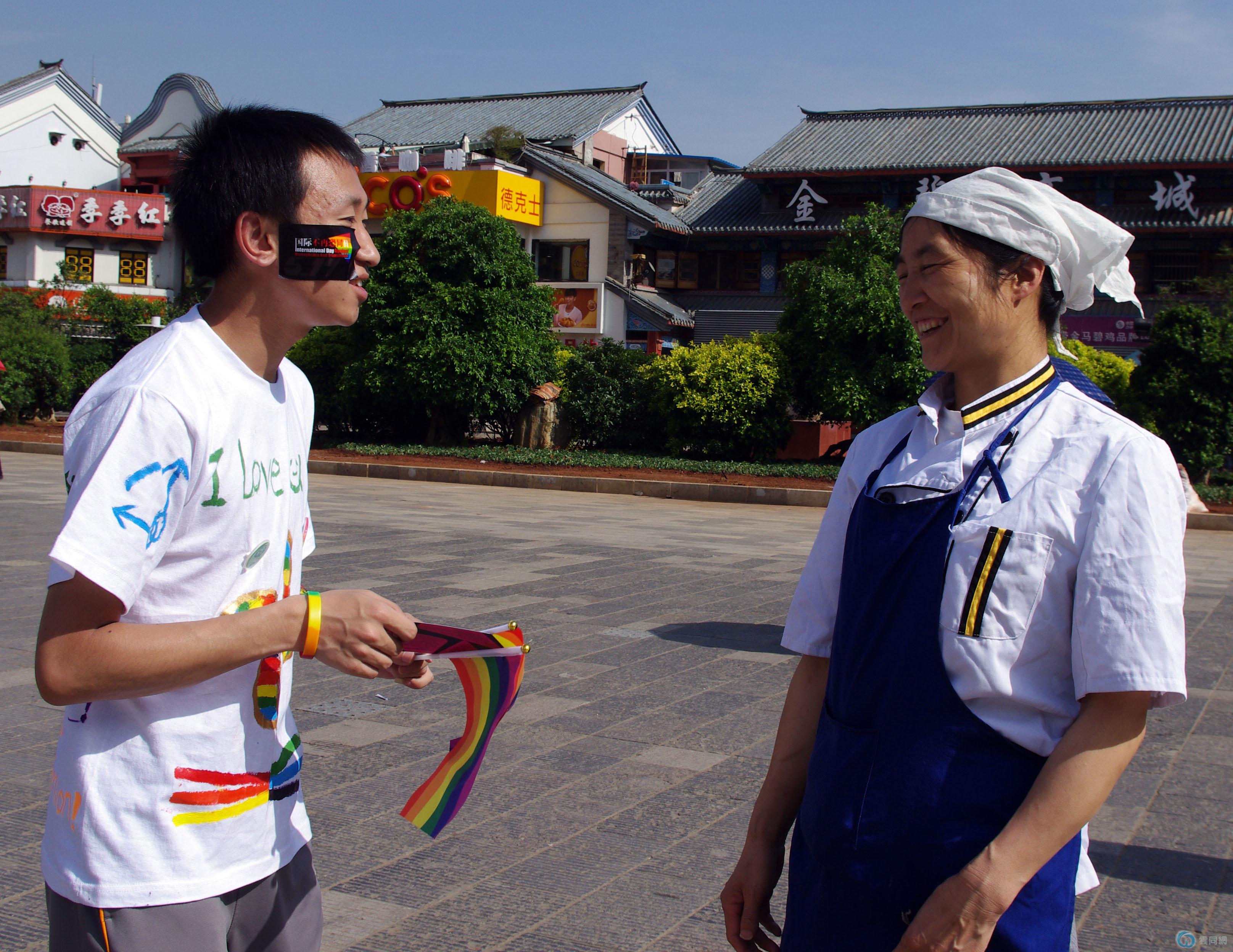 我们在与路人沟通的过程中,发现有位男士对我们的活动非常感兴趣,我们立刻与之交流。这位男士的态度亦极为开明。我们随之邀请其参与此次活动,但对方因为需要坐下午火车离昆而无法成行。惋惜之余我们赠送名片及彩虹旗、明信片等小礼物。↓