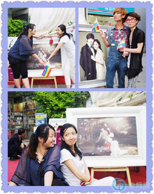 志愿者们在与婚纱摄影店老板&街头MC进行沟通协商,介绍我们这次行为艺术的初衷,希望得到他们的支持。婚纱店的直人男老板很通情达理,给我们场地并支持我们;街头MC似乎有点恐同,不接受我们的友善邀请。
