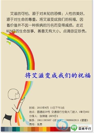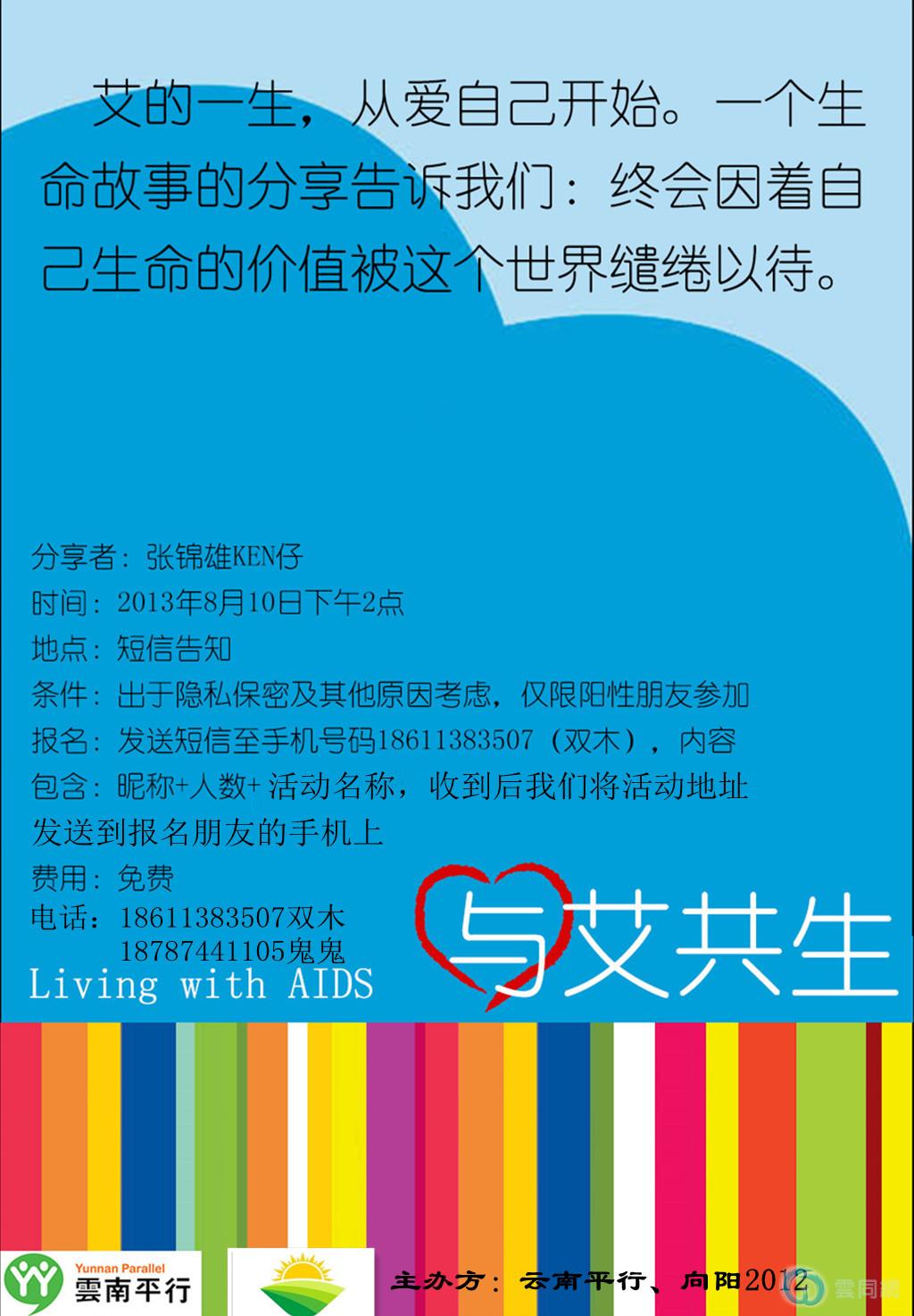 【报名方式】编辑短信昵称+人数+参与活动名称(与艾共生、当生命遇上艾滋、将艾滋变成我们的祝福)发送到18611383507回复报名成功