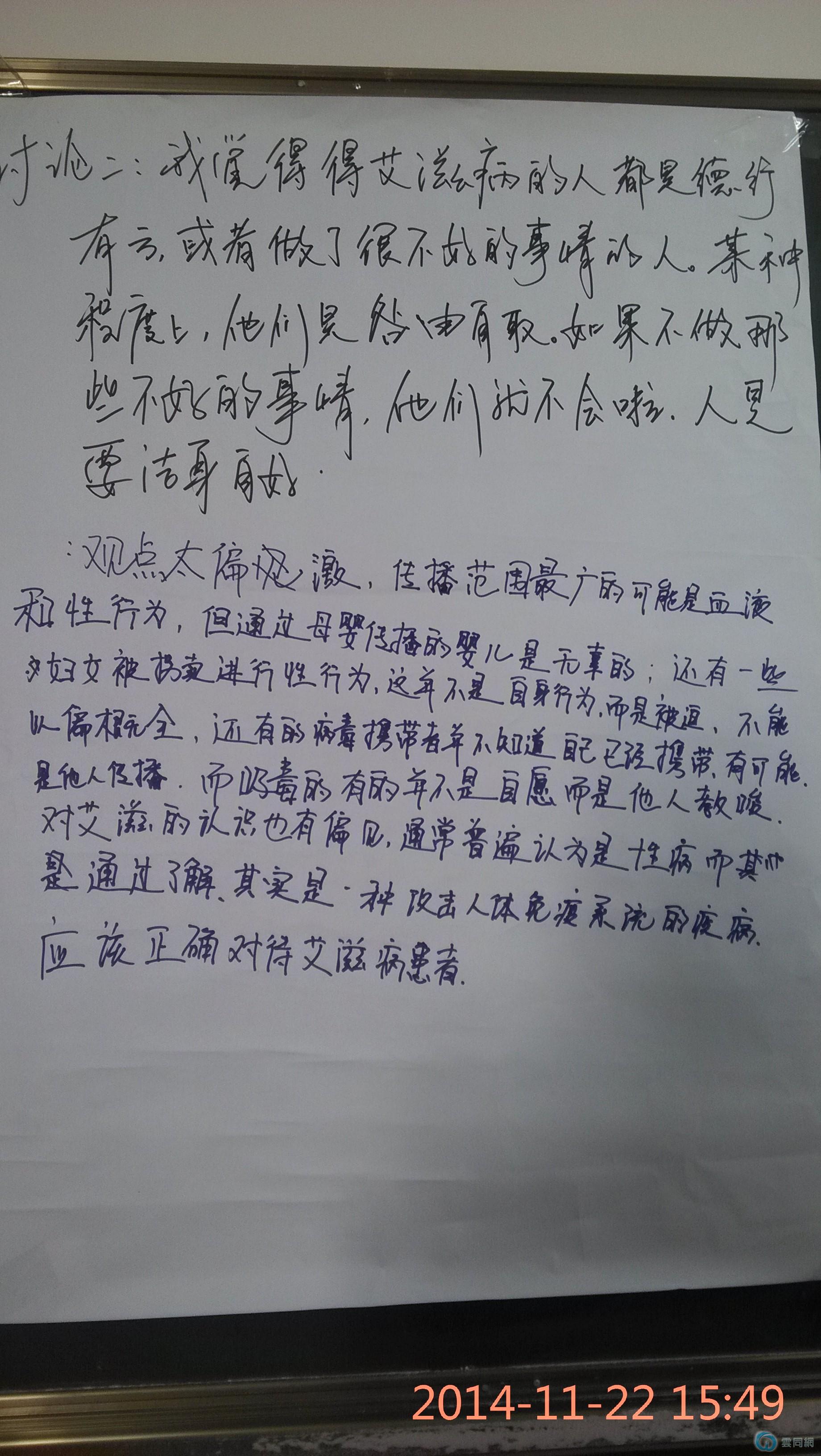 面对即将踏入社会的新一代青年,真正对艾滋病的了解也不是很深。什么是艾滋病?在场参与者的回答都吱唔不全。于是志愿者们便告诉大家,艾滋病是人类获得性免疫缺陷综合征。并且针对人类获得性免疫缺陷综合征四个关键词做了深入的解释。接着是艾滋病的分期的讲解,包括窗口期,潜伏期,发病期。且针对每个分期做出相应的解释,再多方补充引申。当问大家艾滋病的传播条件有哪些,大家异口同声的说,血液传播,母婴传播,性传播。知识永远是知识,行动也永远是行动,可见,新青年们对艾滋病并不知晓!