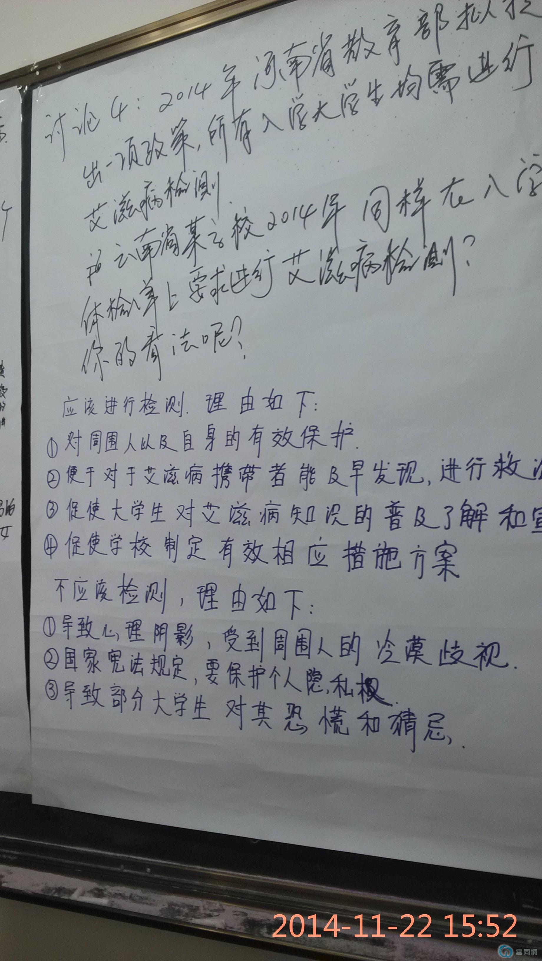 11月22号,这些志愿者们在云南师范大学文理学院举行了“识艾防艾以爱迎艾”活动。经文理学院青协的志愿者热情邀约就餐后,紧接着在教室平行志愿者为参与者对“艾滋”这个陌生而又令人发指的怪物进行宣讲。伴随着“美国群星演绎艾滋病宣传歌曲”视频,大家进行了破冰游戏,玩的是大风吹的游戏。几轮游戏结束后,即使大家彼此还相对陌生,但很快融入这个话题当中。随后,志愿者们便开始以视频内容讨论艾滋病这一主题,大家各抒己见,渐渐的了解艾滋病。之后便抛出一个问题,让在座的大家说说性传播疾病有些什么,尽管意见不太统一,但大家基本都回答了梅毒和淋病。志愿者们便阐述了国内常见的性病有:梅毒,淋病,尖锐湿疣,生殖器疱疹,当然,也包括艾滋病。