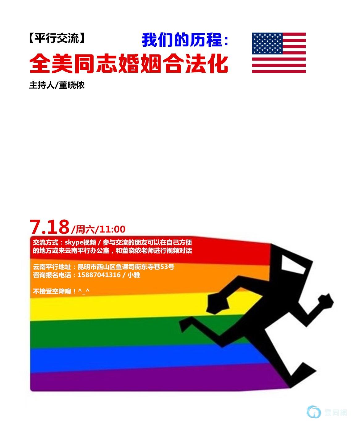 美籍华人董晓侬,昆明医科大学客座教授,云南省健康与发展研究会首席专家,已在昆明发起并运作孟连“光荣学生”项目6年。最近他关注到“美国50州的同性恋婚姻合法化”,并且对此做了比较深入的研究,现在他希望有对这个话题感兴趣的朋友,一起加入到与此相关的视频交流当中。