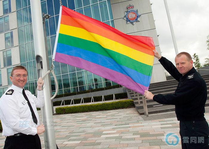5月17日,英国曼彻斯特,警察局副局长与一名军士升起彩虹旗,为国际不再恐同日活动揭幕。