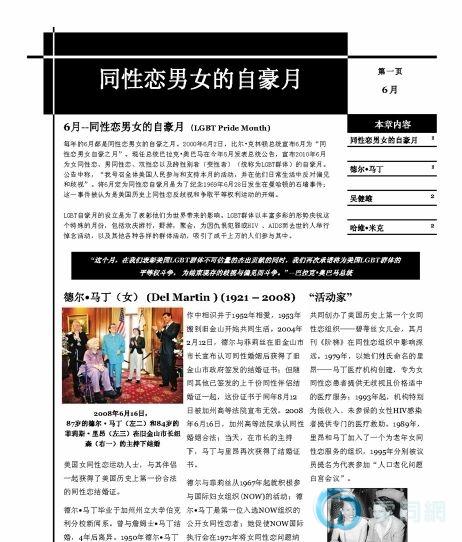 近日,继美国总统奥巴马发布确立6月为美国同性恋骄傲月的总统公告之后,美国驻成都总领事馆制作并发行了同性恋骄傲月宣传册。该宣传册选择了向中国公众介绍三位知名的美国同性恋公民,分别是同性恋运动活动家德尔?马丁(女) (Del Martin )、作家杜鲁门?卡波特)(Truman Capote)以及政治家哈维?米 克 (男) (Harvey Milk, 又 译米尔克)。