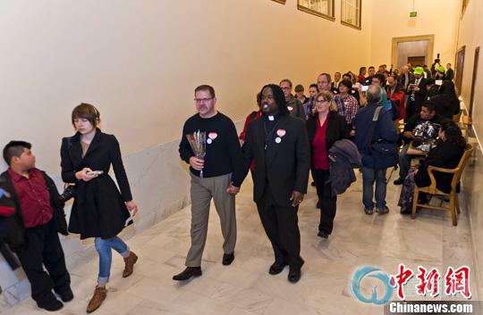 当地时间2月14日是情人节,旧金山市政府大厅满是登记结婚的新人。