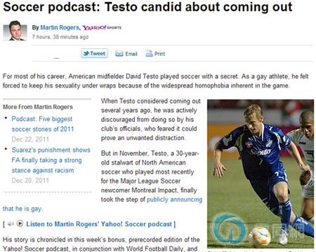 在他职业生涯的大部分时间内,美国中场球员大卫-德图总是带着一个秘密上场踢球。作为一名同性恋足球队员,他觉得只能被迫掩饰自己同性恋的背景,因为他的性取向与绝大多数球员并不相同。当大卫-德图几年前考虑公布自己是同性恋时,他所在足球俱乐部的官员总是劝阻他别这么做,他们害怕这可能会带来不必要的麻烦。