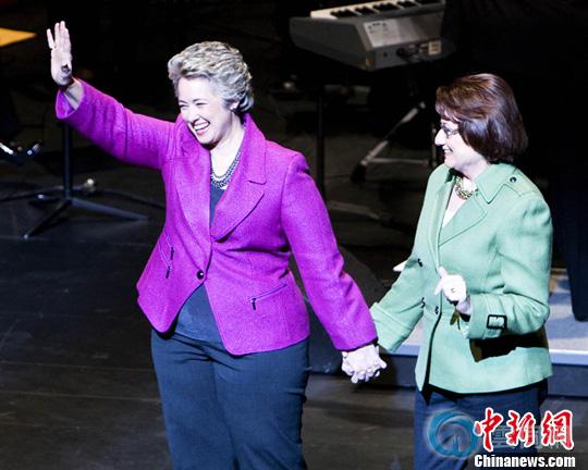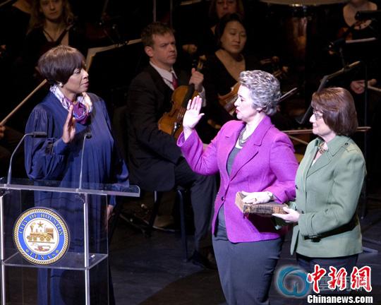 当地时间1月3日,是美国元旦公共假期结束的第一个工作日,休斯敦市政府举行隆重仪式,安妮丝.帕克携同性伴侣在联邦法官的带领下宣誓,就任这个美国第四大城市的市长,而在就职典礼上为新市长手捧《圣经》的人,就是她的同性伴侣凯西·哈巴德。中新社发贾忠 摄