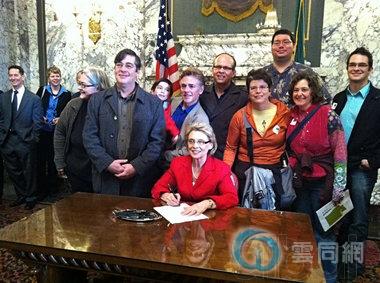 美国当地时间2012年2月13日上午11:30,Chris Gregoire 州长签署法令,华盛顿州正式成为第七个允许同性婚姻的州。