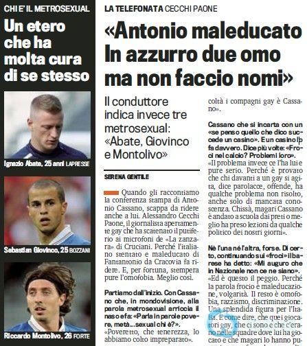 小组赛首轮1-1战平西班牙让意大利收获了不少媒体的称赞,但蓝衣军团的危机并没有因此而消除。笼罩在意大利队头顶上的赌球阴云还没有散去,同性恋疑云再次让普兰德利球队的备战计划受到干扰。同性恋的话题首先由意大利主持人亚历桑德罗-切基-帕奥内曝出,这位已经出柜的主持人透露如今的国家队中有一对同性恋,一个双性恋,还有三个都市美男。