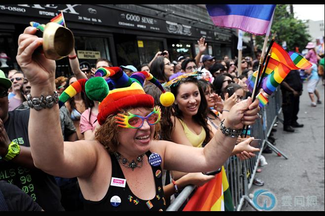 人们开心地挥舞着彩虹旗,身上也是一副彩虹图案的装扮。虽然遭到纽约有影响力的宗教团体的反对,但新法依然获得了通过。纽约州州长库莫(Andrew Cuomo)于上周五晚间签署了这项法律,将在30天后生效。