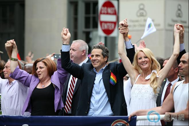 欢呼的众多支持者向库莫(中)问好,他和身为美食频道(Food Network)女主播的女友桑德拉·李(Sandra Lee)(穿白裙者)、纽约市长彭博(Michael Bloomberg)(最左边)以及穿紫色上衣的纽约市议会议长奎恩(Christine Quinn)等一同开启了大游行。奎恩是公开的同性恋者。