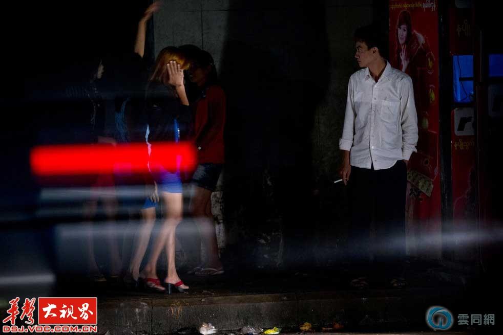2012年9月2日缅甸,一辆汽车停在仰光市区的马路上。路的另一边,一名男子正注视着性工作者。