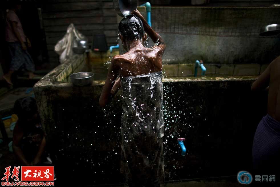 2012年8月27日,炎热的夏天,在仰光郊区的一家艾滋病疗养院,一名艾滋病患者往头上倒水来降温。