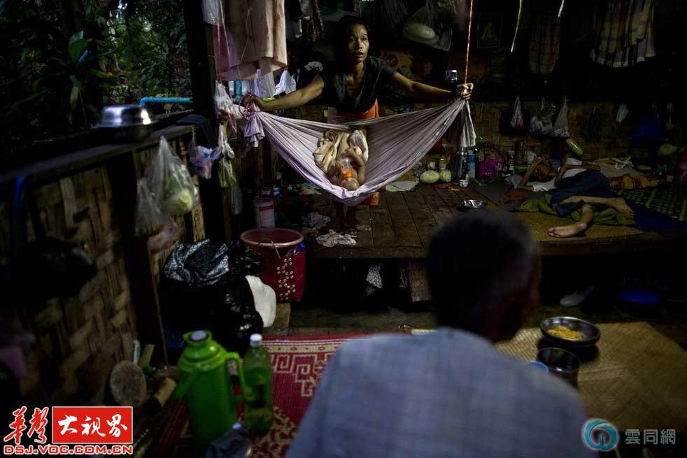 艾滋病中心,在这间多人共享的小屋内,这名叫Maw的36岁女子是一名感染艾滋病的母亲,她在为她5个月大同样感染艾滋病的女儿摇晃吊床。2012年8月29日。