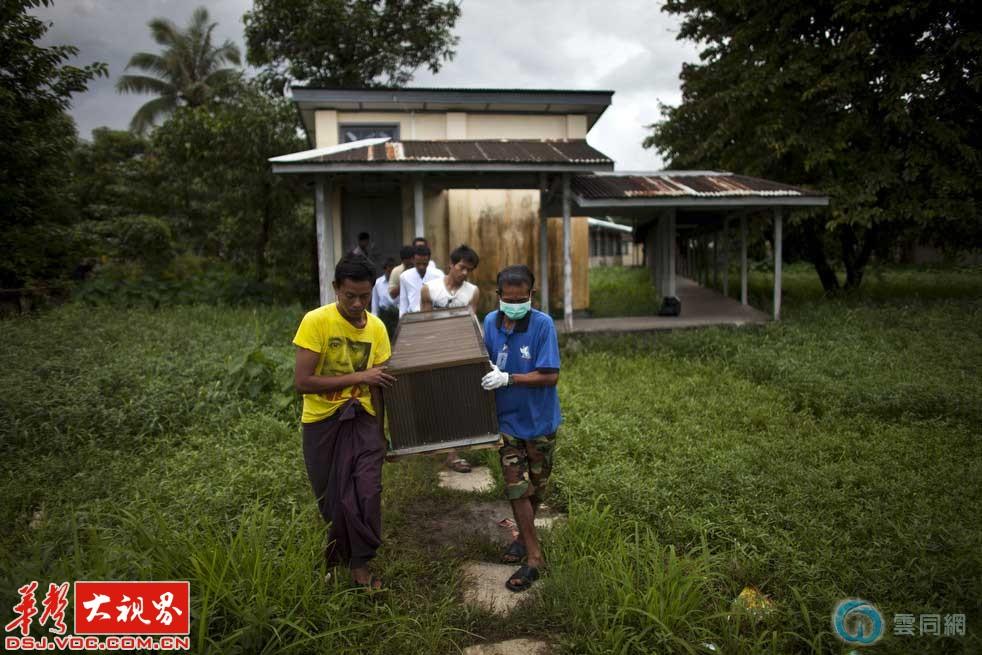 艾滋病中心的太平间,KyawNaingAung,29岁,工作人员搬动他的尸体,并给他举行一场免费的简单葬礼。
