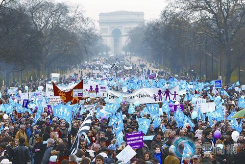拯救婚姻,拯救家庭、有父亲、母亲才有孩子,这是反同性恋婚姻抗议者13日在巴黎埃菲尔铁塔下打出的标语。法国总统奥朗德为兑现其竞选承诺,大力推动同性恋婚姻和同性恋夫妇收养子女合法化的进程,但这个颇具争议的社会问题在法国引发巨大抗议潮,数十万人13日从法国各地涌向巴黎,反对同性恋婚姻法案,认为这将破坏传统家庭价值,对社会文明产生消极影响。有法国媒体称,这一社会问题有政治化的倾向,将成为奥朗德上台以来遭遇的最大考验。
