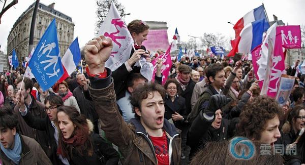 法国国民议会2月12日投票通过了允许同性结婚及收养子女的法案。这项法案将于4月2日交由参议院投票审议。24日的游行有数十万的抗议人士参加,包括保守派活动人士、小孩、退休人员和神父,他们旨在做最后一击,以阻止同性恋婚姻法案的通过。法国当局证实,3月24日大约有30万人参加了示威活动,人数稍微少于1月份举行的那次抗议活动。不过游行组织者估计的数字为140万,高于1月份的游行。
