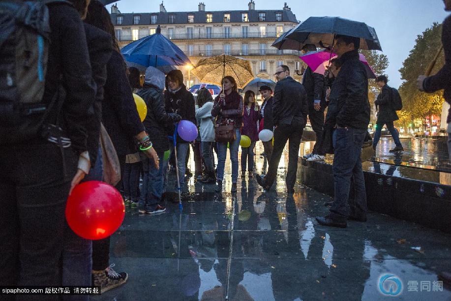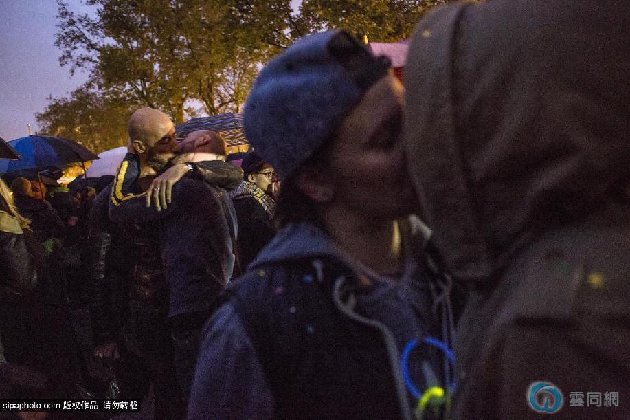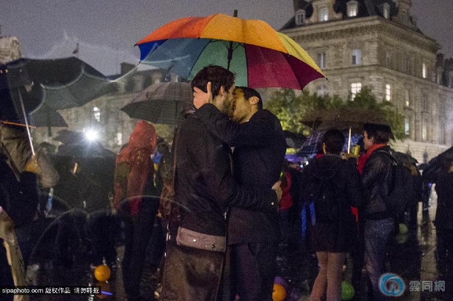 当地时间2014年10月6日,法国巴黎,正在当地进行的反对同性恋结婚合法化大示威游戏活动,在一天后迎来了“场面升级”,上百对同性恋示威者们在傍晚冒着小雨聚集在广场上,在同一时间开始亲吻彼此,以这样温馨浪漫的动作进行“无声的示威”。