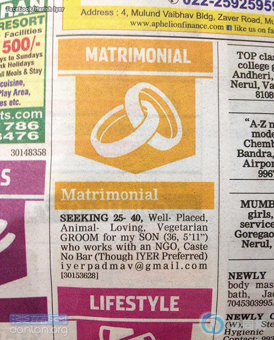 广告上写着:“为我的儿子诚寻25至40岁之间的新郎,要求社会地位良好,喜爱小动物,素食主义者,种姓不限(最好是耶尔)。我的儿子36岁,身高5英尺11英寸(约1.80米),为NGO工作。”