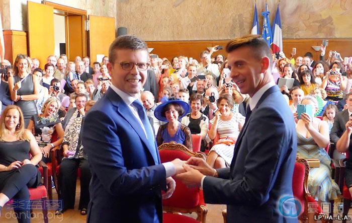 拒外媒报道:法国社会党议员吕克·卡乌纳(Luc Carvounas)和同性伴侣斯蒂芬·埃斯波西托(Stéphane Exposito)在巴黎东南郊的阿尔福维尔市政厅举行婚礼。
