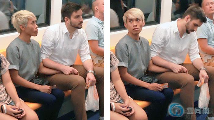 这是一组在网络上流行甚广的照片,拍摄于曼谷的地铁车厢里。照片中的黄发男子名叫坎迪(Naparuj Mond Kaendi),是一位泰国导演和模特公司创意总监。他身边的男子名叫米德(Thorsten Mid),来自德国,是模特。从他们手牵手的姿态不难判断,这是一对幸福的同性恋人。