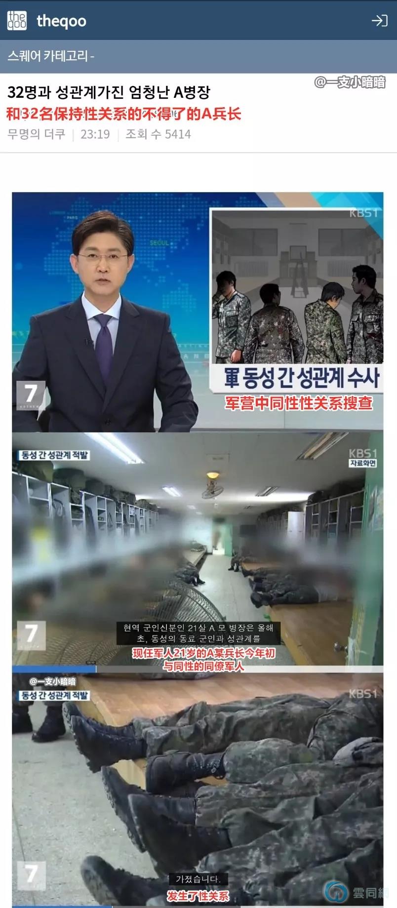 据韩国媒体报道,一名21岁的兵长与包括17名军官10名副士官在内的共计32名男性发生了性关系。这位21岁的兵长,相当于一个小官,他的手下有3-5名军人属于他管理。然而,在这一事件里面,与他发生关系的战友当中,其中17名都是军官,还有10名的副官。这位21岁的兵长能够当上兵长,也成为网友们质疑的焦点,他能够搞定这么多比他官职更大的战友,一定有一些手段。