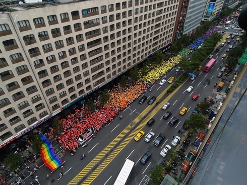 “同志加油!台湾加油!”上万名“同志”走上街头,为了就是要争取认同,大队人马在走到忠孝东路时,活动也到达最高潮:“五四三二一,成功!”破天荒用人墙排出了号称全台最大的彩虹旗帜,这个象征“同志”精神的彩虹队伍,红橙黄绿蓝靛紫,绵延至少1公里。台湾“同志”游行下午从“国父纪念馆”出发,众人挥舞着彩虹旗,有人打扮成护士、有人穿着水手服,以嘉年华会的型态和造型,参加这一次的“同志”游行。
