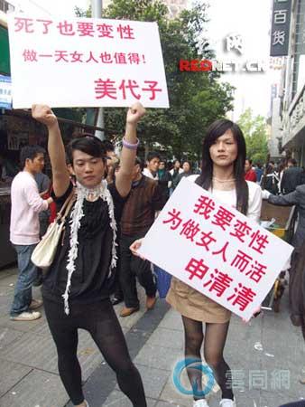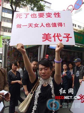 此时,申清清高举一广告牌称“我要变性,为做女人而活”,而美代子的广告牌上则显示“死了也要变性,做一天女人也值得”,就连举牌子的姿势都“惹火撩人”,引得无数好奇的市民驻足。