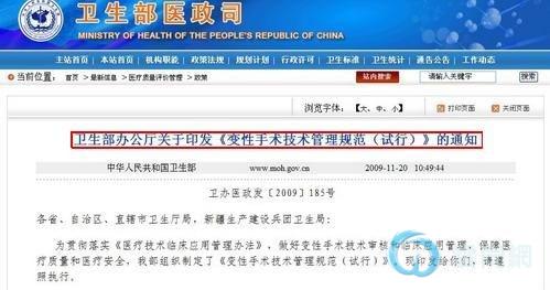 卫生部官方网站上发布的《变性手术技术管理规范(试行)》公告