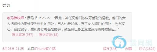 吕丽萍转发的某牧师微博日志以“羞耻”、“罪人”等词汇描述同性恋群体,其中一条声称:“纽约州议会昨晚通过了同性恋婚姻合法化提案。这是美国第六个通过类似法案的州,也是最大的一个州。求神怜悯这片日益堕落的土地!即使有一天若这里法律规定反对同性恋会被判刑,我也仍然要传讲:同性恋是罪。神爱罪人,但神恨恶罪!信靠耶稣,胜过罪恶,出死入生。”