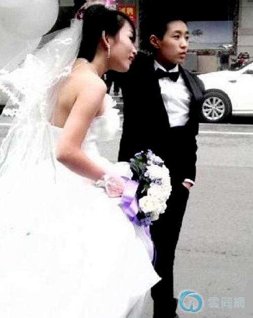 新郎吉先生一身笔挺的黑色西服,阳光帅气。新娘雪琴一身洁白的婚纱,脸上撒满了笑意。【图片由新郎提供】