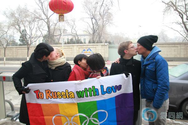 俄罗斯驻北京大使馆的高墙外有一个倒计时大钟在为索契冬奥会倒计时,三对情侣在这个大钟前接吻,十多名活动人士则在一条写有“以爱致俄罗斯”(To Russia with Love)的彩虹色横幅后面欢呼。