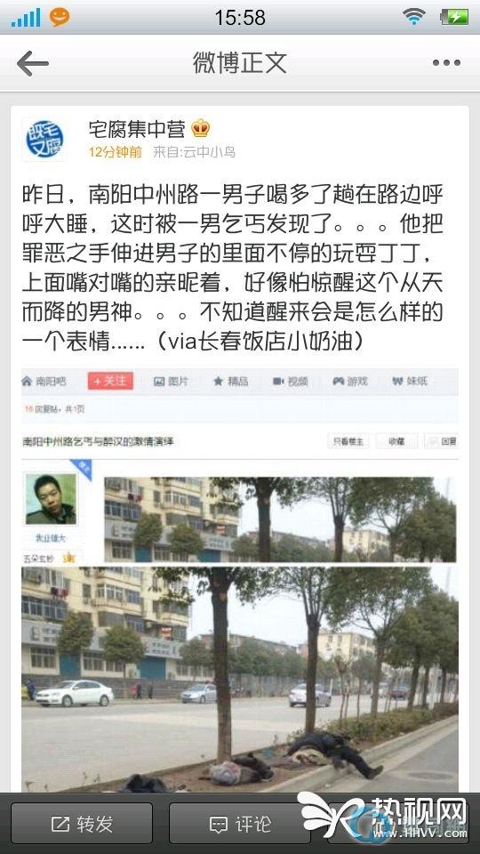 南阳中州路乞丐与醉汉的激情演绎, 近日南阳中州路一男子喝多了趟在路边呼呼大睡,这时被一男乞丐发现了。。。他把罪 恶之手伸进男子的里面不停的玩耍丁丁, 上面嘴对嘴的亲昵着,好像怕惊醒这个从 天而降的男神。