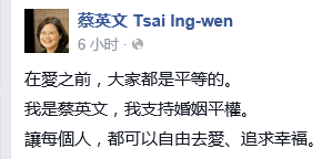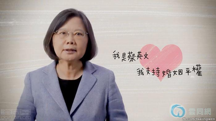台湾领导人大选候选人,民进党主席蔡英文(10月31日)在Facebook分享视频,声援今天下午的台湾同志游行和同性婚姻合法化。她说,在爱面前,大家都是平等的,“我是蔡英文,我支持婚姻平权”。