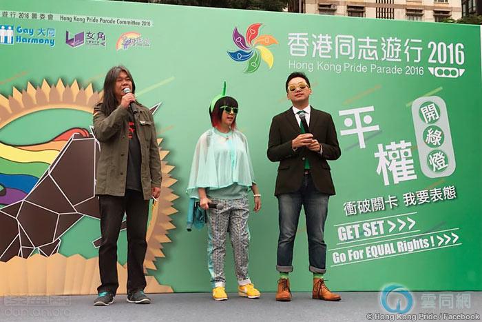 本届巡游彩虹大使由立法会议员梁国雄(上图左起)、电台DJ茜利妹和立法会议员杨岳桥担任,主题颜色是绿色,呼吁为平等“开绿灯”,主题图案则是“冲关牛”,寓意冲破阻碍、勇往直前。