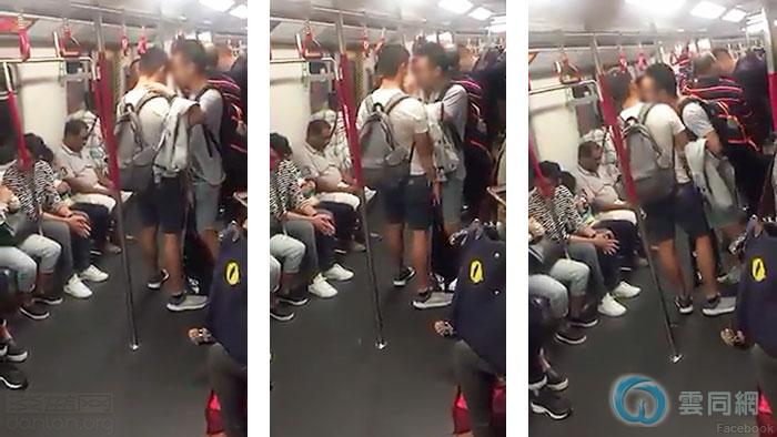 香港网民4月24日通过Facebook公开社团“S突发HK”分享视频,显示两位年轻男子在挤满乘客的港铁车厢里亲密互动,其中一人轻抚对方后背,然后捏了一下他的脸颊,还有貌似亲吻的动作,看上去像是一对同志情侣。
