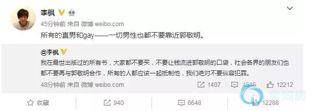 现在,郭敬明必须直面李枫的实名指控。李枫转发这篇微博并@共青团中央公安部打四黑除四害人民日报公安部刑侦局中国政府网微博法律,称:“希望你们能将这些事情上报,帮助我追究他的法律责任,给他严惩,不要让这些肮脏的东西成为社会风气。”