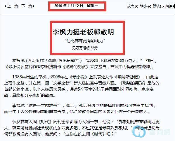 有关李枫的叙事,我们现在可以肯定的事实有三:一是李枫确实是郭敬明旗下的签约作者。二是郭敬明当年确实为李枫站过台写过序。三是两人曾一起去四川,的确是去了3天时间。