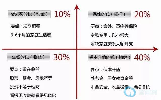 有目标以后,确定你的财务现状,算好你目前的资产和负债情况,以及收支情况(记得一定一定要买保险)。随后按照“标准普尔家庭资产配置图+投资100法则”,检查整个资产配置组合,画一张家庭资产象限图↓