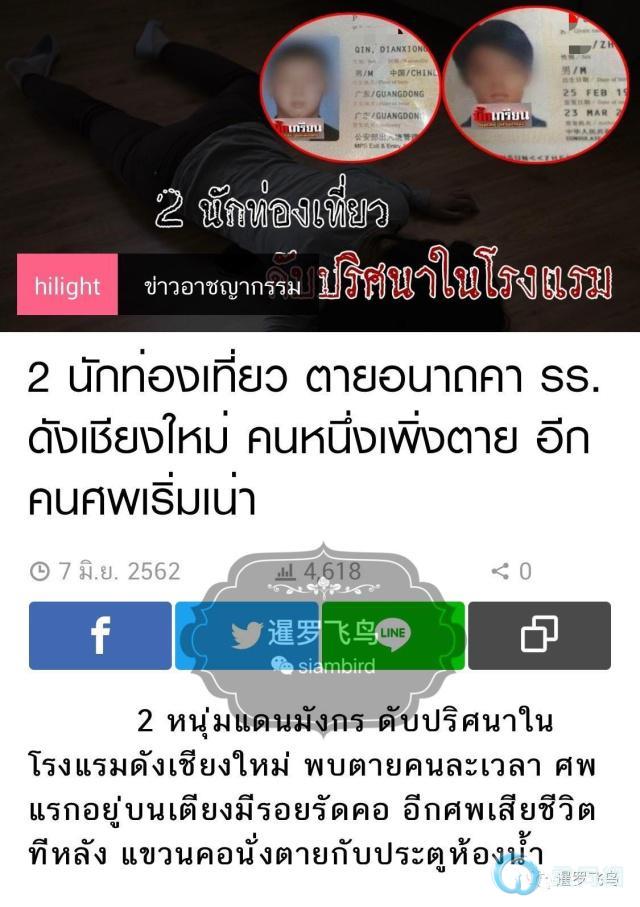 据泰媒6月7日报道,两名年龄分别为29、30岁的中国男子在清迈一五星酒店内暴毙。警方6日下午到达该酒店12楼的VIP豪华套房时,房间已发出尸体腐烂的气味。
