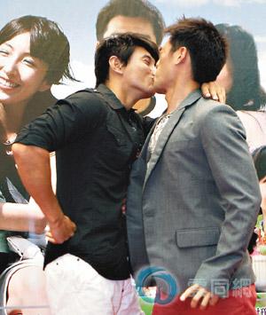 吴奇隆(左)与窦智孔在“牵牛花开的日子”试片会上示范男男接吻